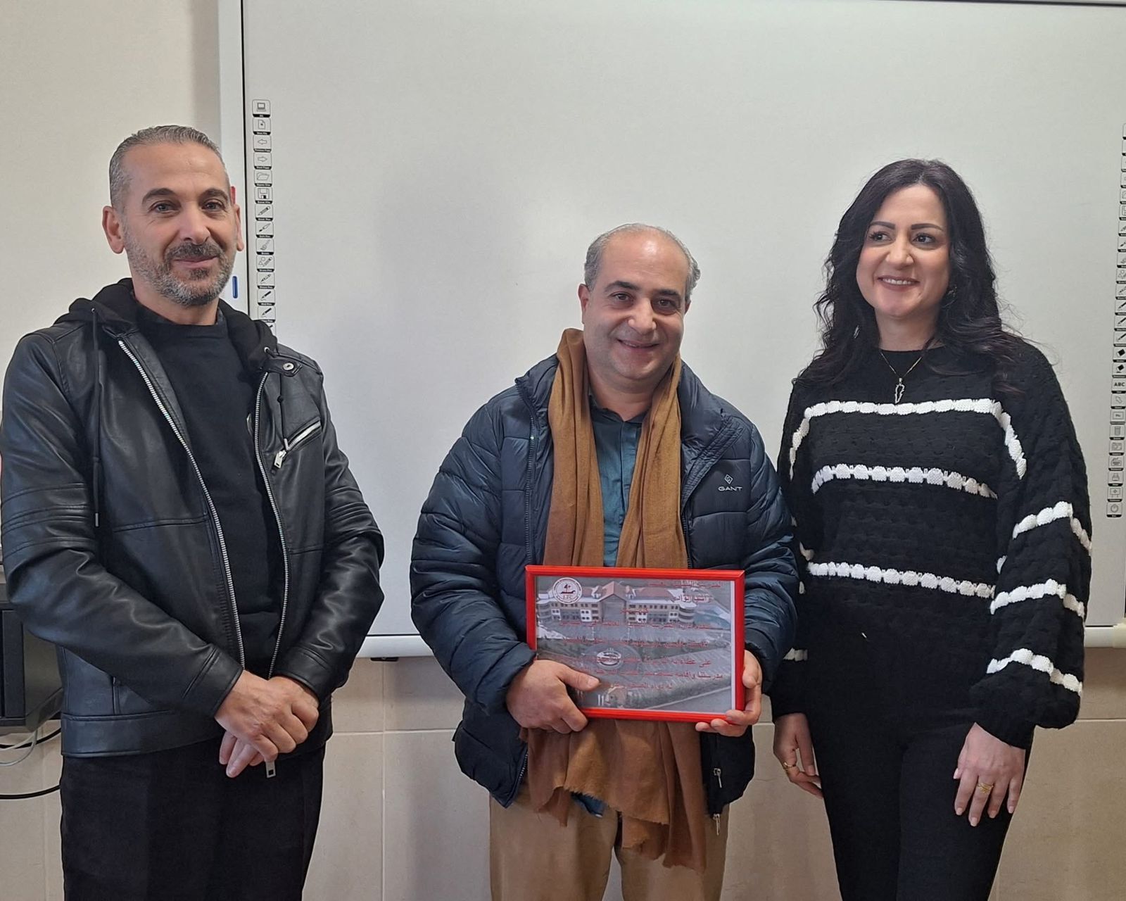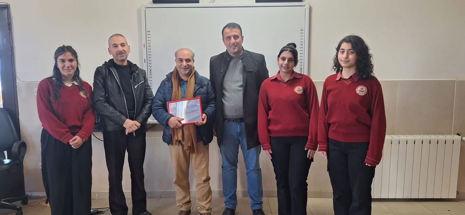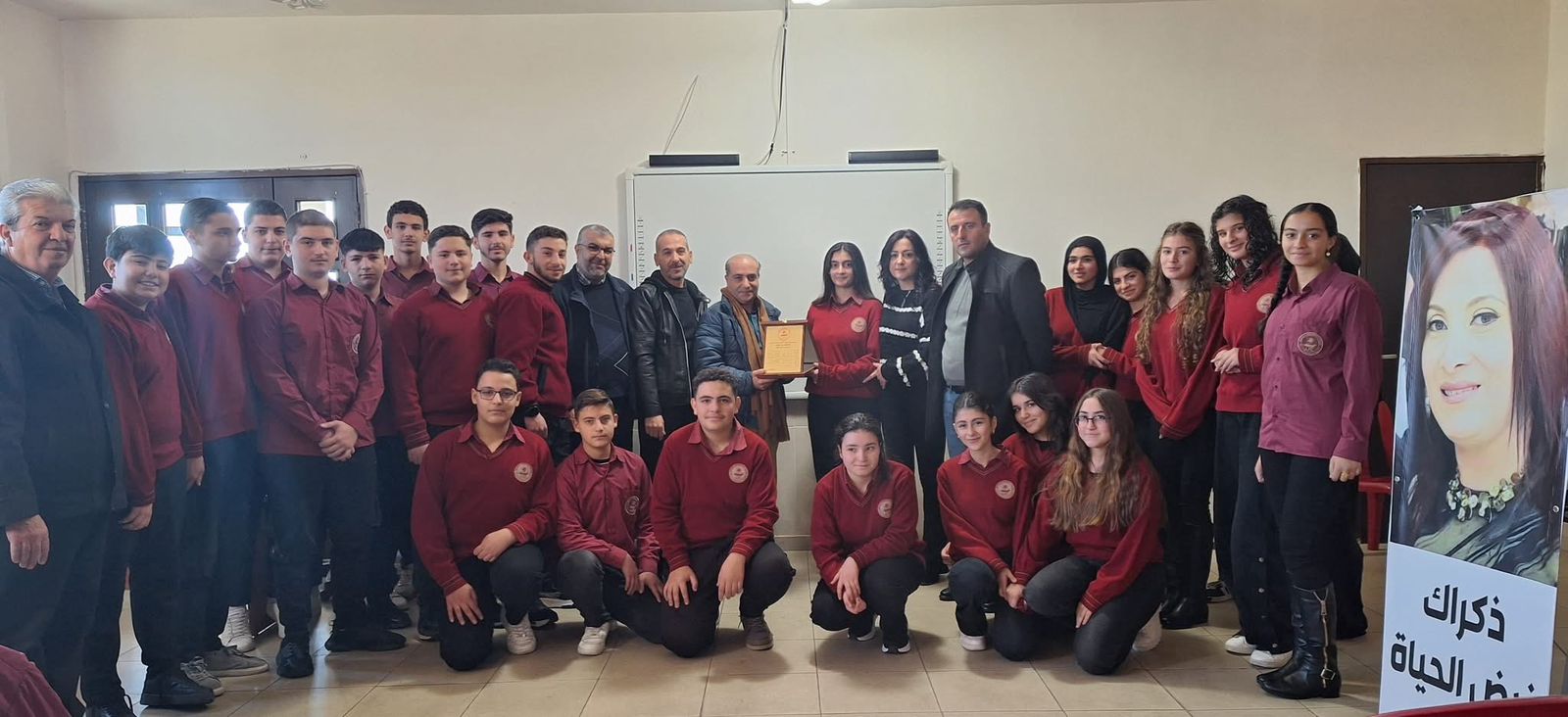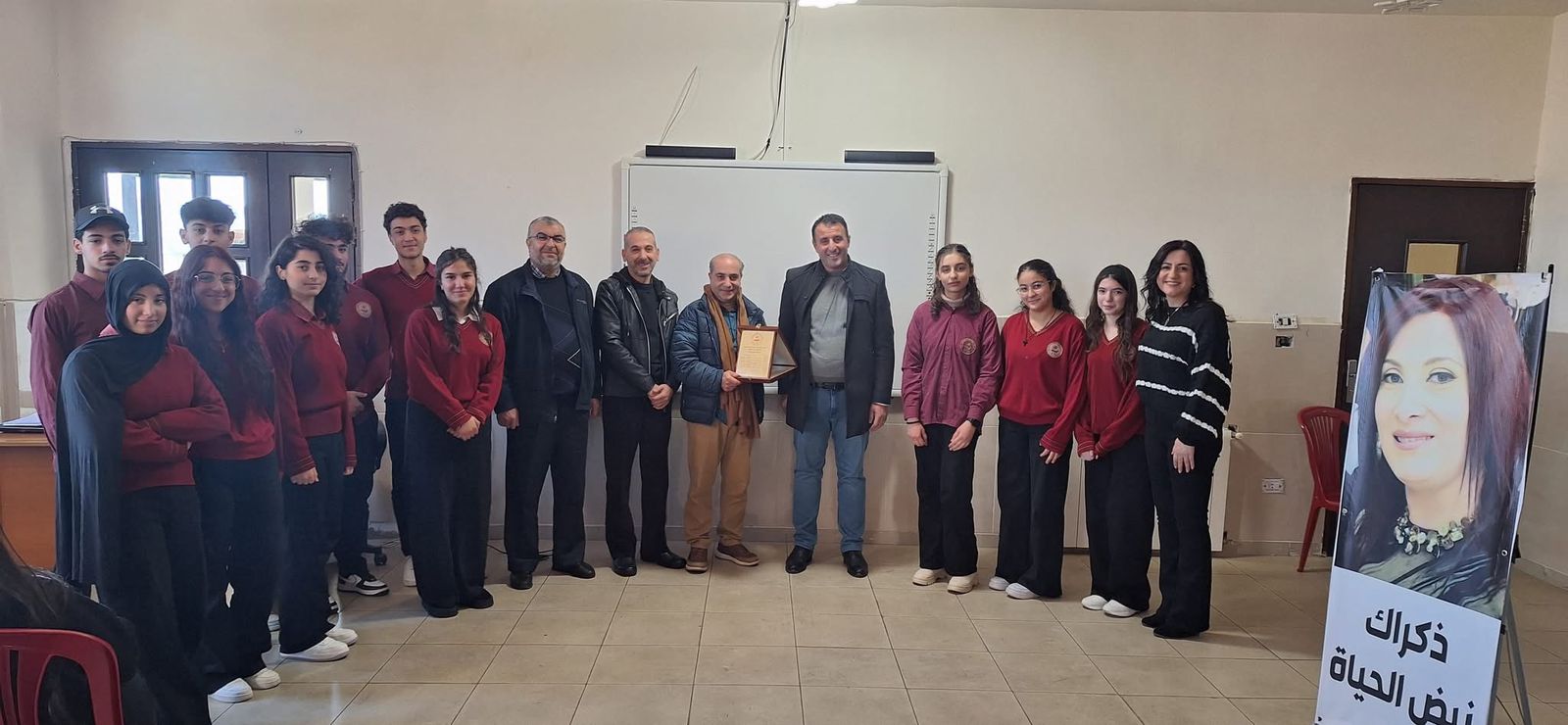 وفي الختام، قام مدير المدرسة الأستاذ وائل غازي، إلى جانب منسق اللغة العربية الدكتور أيمن عثمان، والأستاذ عماد خير، والمعلمة أليسار أبو لطيف، بتكريم الشاعر بدرعٍ تذكاري ، كما قدّمت له المعلمة أليسار أبو لطيف نسخة من كتاب والدها الراحل عارف أبو لطيف (حين يتكلّم الطين)، ودرع تقدير قدّمه طلاب الصّف العاشر.